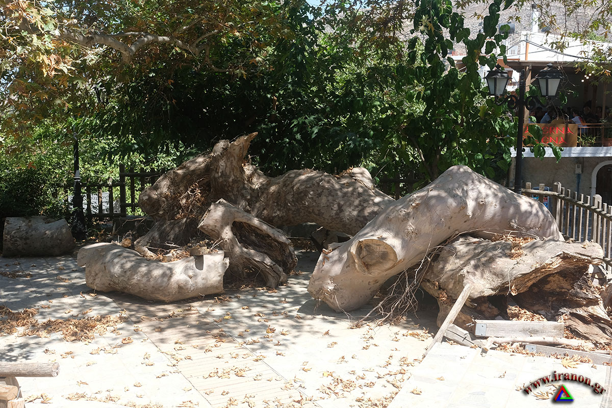 Πάνω: Ο πλάτανος, όπως ήταν τον Μάιο του 2003. Διακρίνονται καθαρά οι συνδετικοί βραχίονες μεταξύ των κλώνων. Κάτω: Αύγουστος 2025. Οι κλώνοι έχουν σπάσει, και τα κομμάτια έχουν μεταφερθεί σε μια άκρη της πλατείας. |