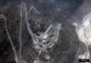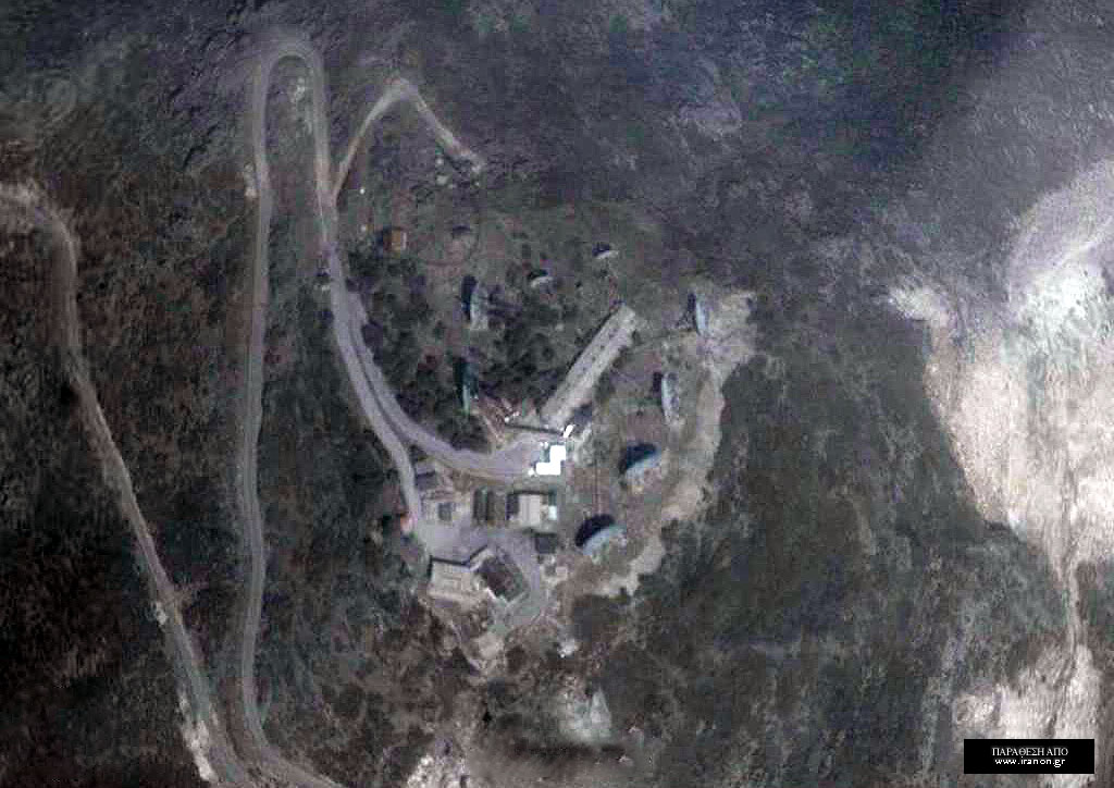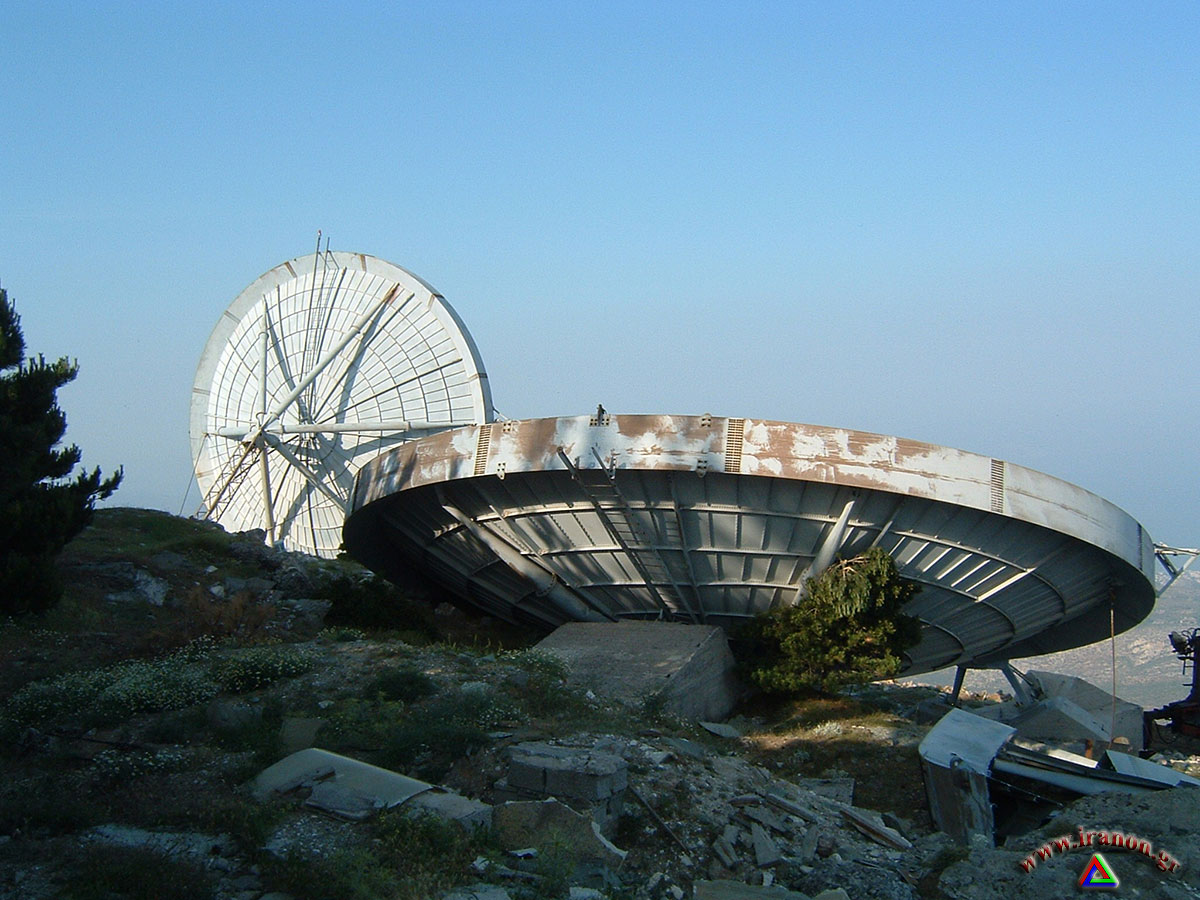 Αριστερά: δορυφορική φωτογραφία του FS Πεντελικού. Διέθετε οκτώ συνολικά πιάτα, έξι μεγάλα και δύο μικρότερα, στραμμένα ανά ζεύγη δυτικά, βορειοδυτικά, βορειοανατολικά και νοτιοανατολικά. Κέντρο και δεξιά: 16 Ιουνίου 2004 – το ξήλωμα και η απομάκρυνση των πιάτων του σταθμού έχουν ξεκινήσει |