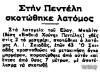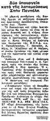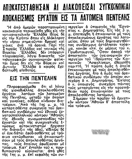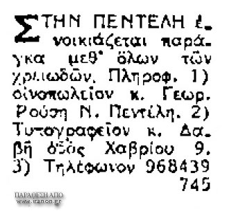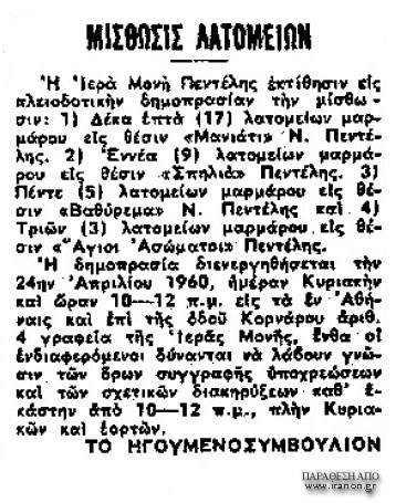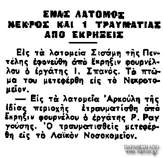 Αριστερά: αποκλεισμός λατόμων στην Πεντέλη. Απόσπασμα δημοσιεύματος της εφημερίδας "Ελεύθερον Βήμα", φύλλο 24/02/1940, σελίδα 4. Κέντρο: «Στην Πεντέλη ενοικιάζεται παράγκα μεθ' όλων των χρειωδών». Αγγελίες του είδους απευθύνονταν και σε λατόμους. Εφημερίδα "Αθηναϊκά Νέα", φύλλο 24/02/1940, σελίδα 1. Δεξιά: τα θανατηφόρα ατυχήματα στην Πεντέλη, εκτός από εργάτες, ενίοτε αφορούσαν και ιδιοκτήτες λατομείων. Εφημερίδα "Ελευθερία", φύλλο 11/06/1965, σελίδα 8. |