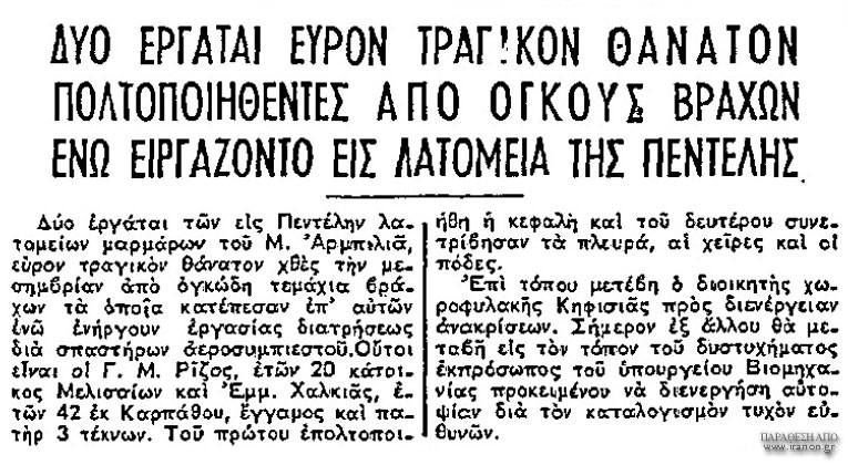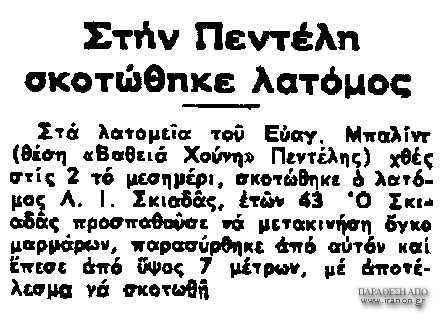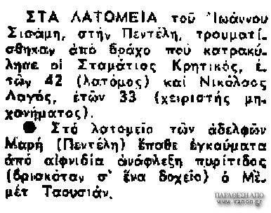 Ένα πολύ μικρό μέρος των δυστυχημάτων και σοβαρών ατυχημάτων στα λατομεία της Πεντέλης. Από αριστερά προς τα δεξιά και από πάνω προς τα κάτω: εφημερίδα "Τα Νέα", φύλλο 13/02/1958, σελίδα 6· εφημερίδα "Ελευθερία", φύλλο 15/04/1964, σελίδα 10· εφημερίδα "Το Βήμα", φύλλο 31/10/1964, σελίδα 4· εφημερίδα "Τα Νέα", φύλλο 20/08/1971, σελίδα 2· εφημερίδα "Το Βήμα" 12/09/1971, σελίδα 2· εφημερίδα "Τα Νέα", φύλλο 06/08/1975, σελίδα 16. Ενδεικτικό της συχνότητας είναι το γεγονός ότι στο πρώτο και πέμπτο από τα παραπάνω δημοσιεύματα γίνονται αναφορές σε περισσότερα του ενός ατυχημάτων, που σημειώθηκαν ανεξάρτητα μεταξύ τους, τις ίδιες ημέρες στα λατομεία. |