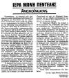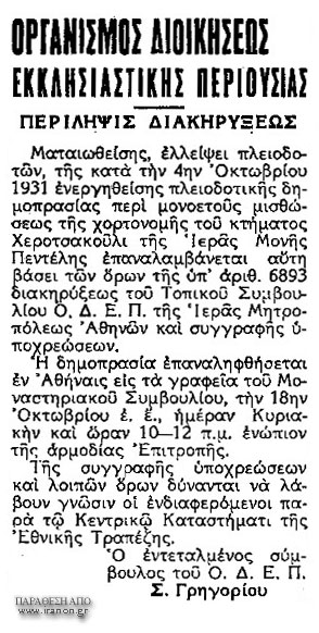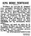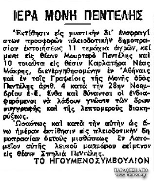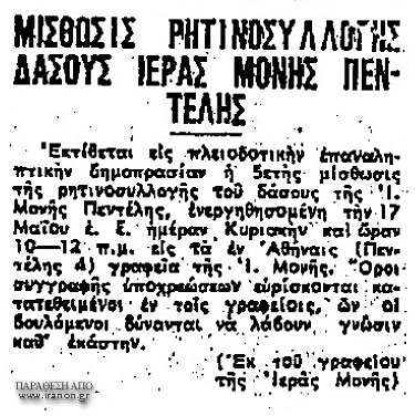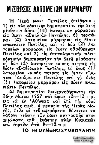 Αριστερά: εφημερίδα "Το Βήμα", φύλλο 16/05/1957, σελίδα 3 (λεπτομέρεια: αρκετές από τις δημοπρατήσεις της μονής διενεργούνταν στα επί της οδού Πεντέλης γραφεία της, στο κέντρο της Αθήνας). Κέντρο: εφημερίδα "Το Βήμα", φύλλο 08/04/1960, σελίδα 6. Δεξιά: σχέδιο του βουνού, με τη μονή Πεντέλης στο βάθος αριστερά. Από γαλλικό βιβλίο έκδοσης 1865, του χαράκτη Ph. Blanchard, φιλοτεχνημένο πιθανώς περί το 1840. |