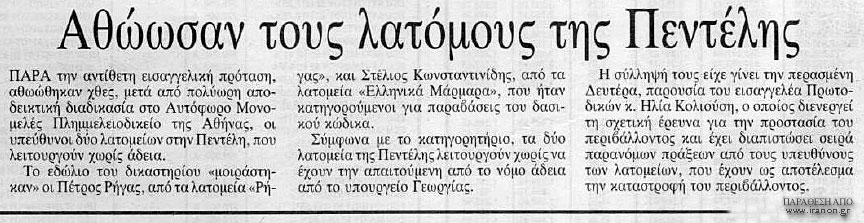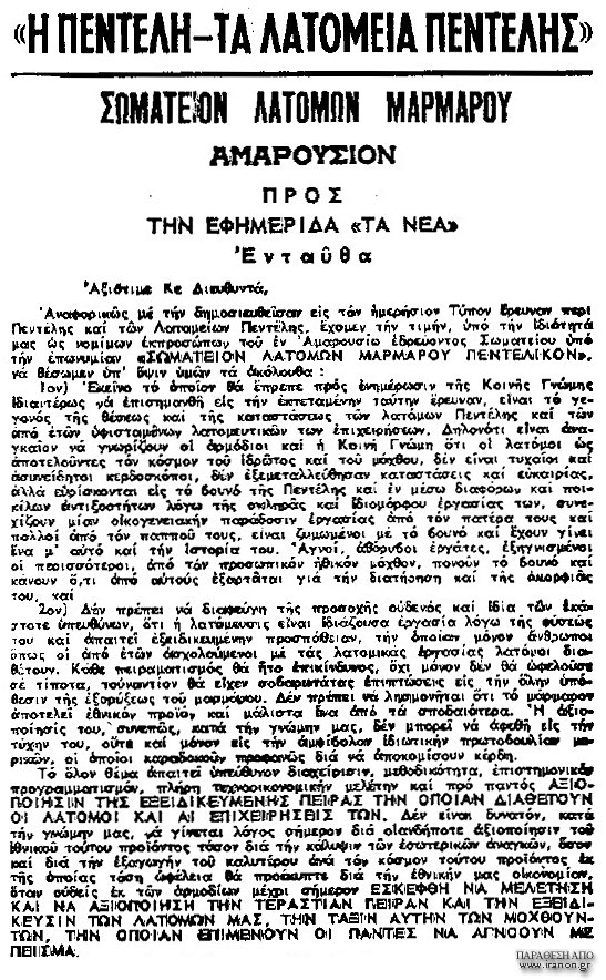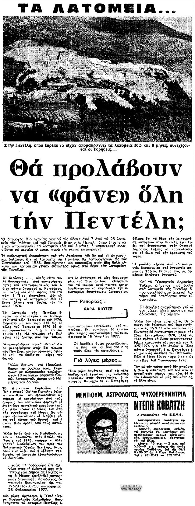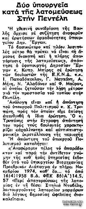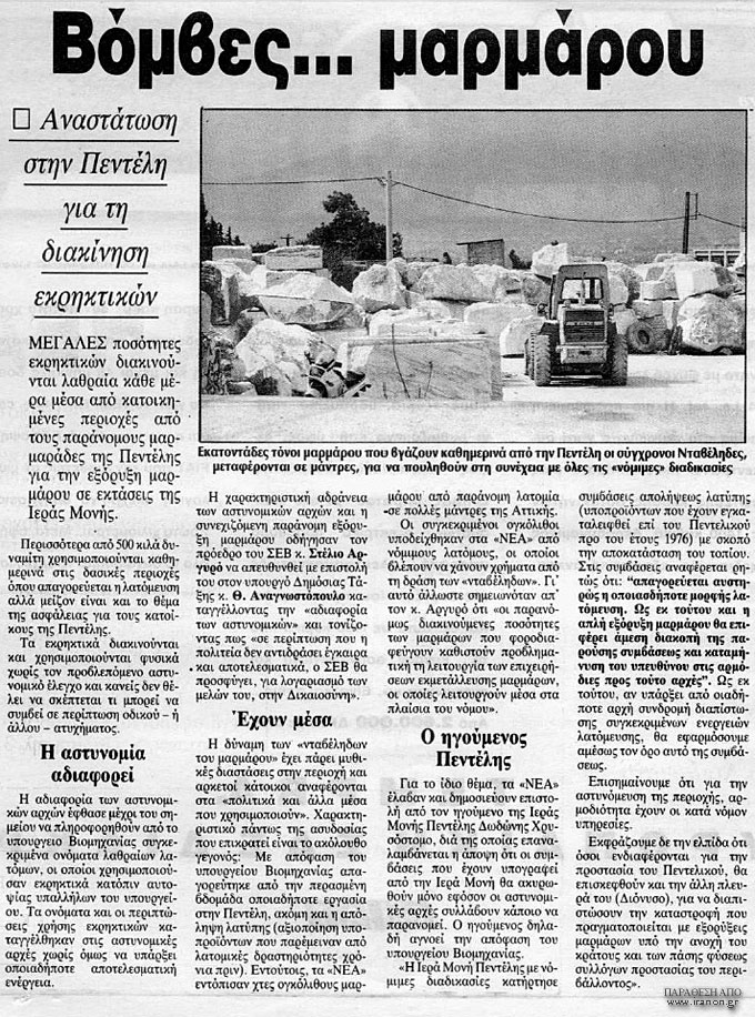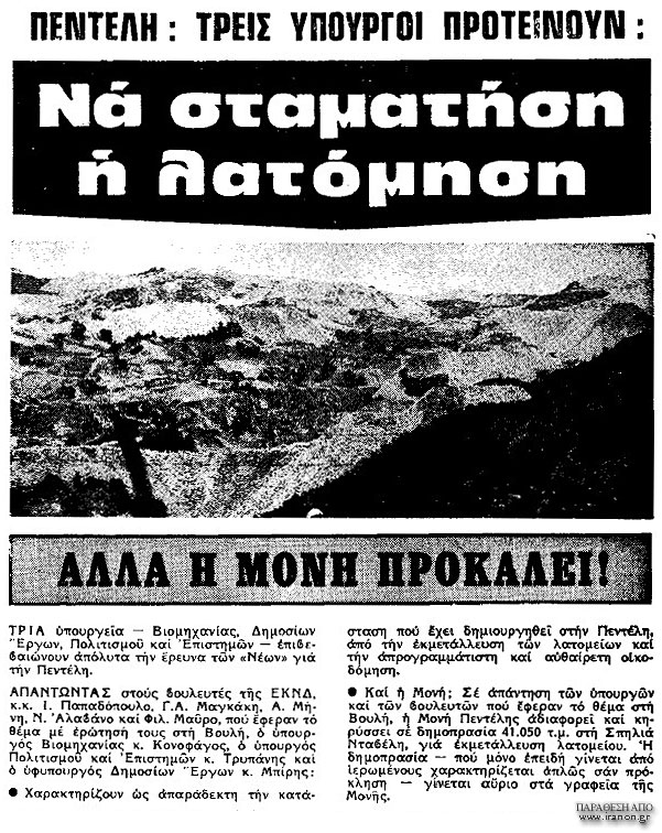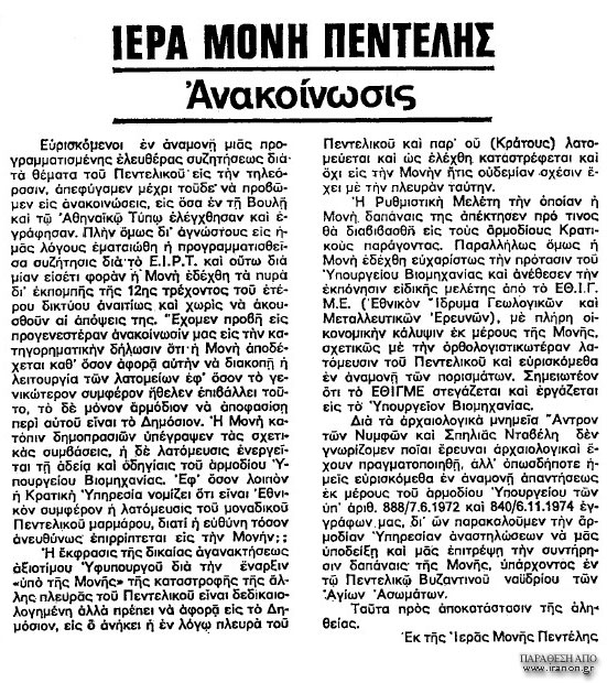 Μικρό δείγμα των πολλών δεκάδων, σχετιζόμενων με τη λειτουργία των λατομείων της Πεντέλης δημοσιευμάτων της περιόδου. Από αριστερά προς τα δεξιά και από πάνω προς τα κάτω: δημοσίευμα της εφημερίδας "Το Βήμα", φύλλο 04/03/1975, σελίδα 3· απόσπασμα δημοσιεύματος της εφημερίδας "Τα Νέα", φύλλο 27/02/1975, σελίδα 5· καταχώρηση στην εφημερίδα "Τα Νέα", φύλλο 21/07/1975, σελίδα 11· απόσπασμα μακροσκελούς επιστολής στην εφημερίδα "Τα Νέα", φύλλο 23/07/1975, σελίδα 12· απόσπασμα δημοσιεύματος της εφημερίδας "Οικονομικός Ταχυδρόμος", φύλλο 02/10/1975, σελίδα 14· δημοσίευμα της εφημερίδας "Τα Νέα", φύλλο 21/09/1977, σελίδα 9. |
