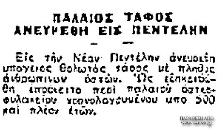 Εφημερίδα "Ελευθερία", φύλλο 01/08/1952, σελίδα 4. Για την ανακάλυψη του υπόγειου αυτού θολωτού τάφου δε γνωρίζουμε τίποτα περισσότερο πέραν όσων αναφέρονται στο δημοσίευμα. |