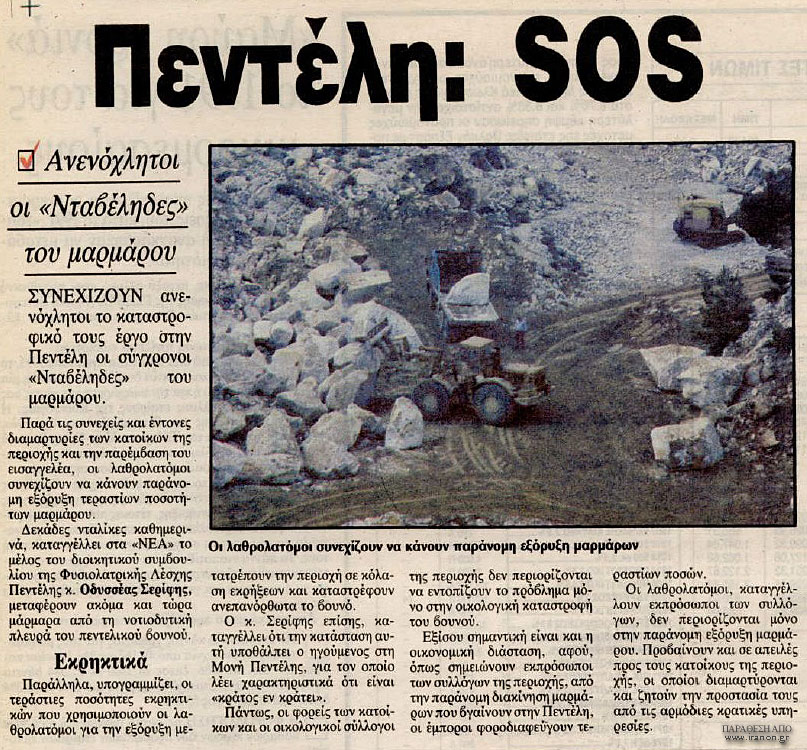 Ίσως κανένα άλλο βουνό στην Ελλάδα δεν υπέστη την καταστροφή στην οποία υποβλήθηκε η Πεντέλη. Τόνοι και τόνοι εκρηκτικών, επί σειρά δεκαετιών, απελευθέρωσαν συνολική καταστροφική ισχύ τάξης βομβαρδισμών. Ειδικά από τη δεκαετία του 1950 και μετά, η κατάσταση έγινε ανεξέλεγκτη, δίχως την παραμικρή μέριμνα για ορθολογική εκμετάλλευση των φλεβών μαρμάρου. Το δόγμα βάσει του οποίου λειτουργούσε το σύνολο σχεδόν των λατομείων ήταν κοινό και απλό: μεγιστοποίηση των κερδών, ελαχιστοποίηση του χρηματικού κόστους, περιβαλλοντικό κόστος αδιάφορο.
