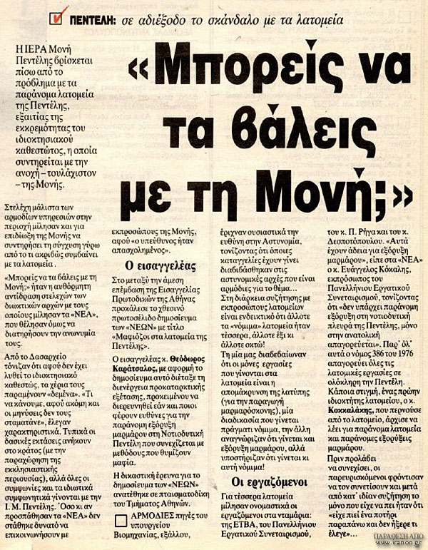 Καθώς η ανάλυση του όλου θέματος ξεφεύγει από τη συζήτηση της παρούσας ενότητας, σημειώνουμε εδώ απλώς τις λέξεις αδιαφορία και διαφθορά. Για όποιον επιθυμεί να κοιτάξει ανάμεσα στις λέξεις, συνιστάται η ανάγνωση όσων καταγράφονται από τον «ΠΑΡ'ΕΙΚΟΣ» εδώ: https://www.iranon.gr/PM/latomoi1.htm.