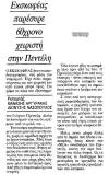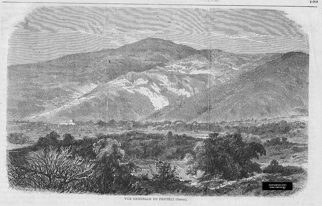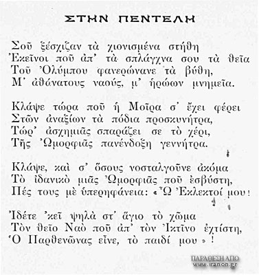 Ποίημα, το οποίο είχε δημοσιευτεί στο περιοδικό "Νέα Ζωή" το 1909 (τόμος 5, αριθμός 59, σελ. 351). Ο συγγραφέας, Γεώργιος Λαμπελέτ, μάλλον δεν μπορούσε να φανταστεί ότι, μπροστά στην καταστροφή των δεκαετιών που θα ακολουθούσαν, η εικόνα που παρουσίαζε η Πεντέλη τη δική του εποχή αντιστοιχούσε σε εκείνη ενός παρθένου τόπου. |