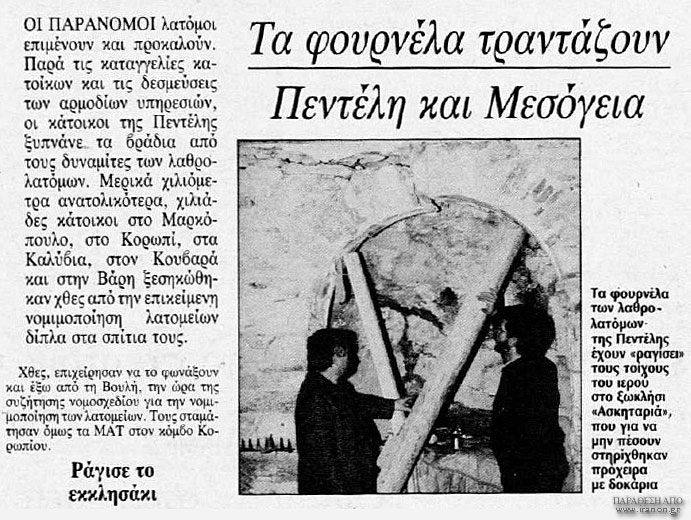 Δημοσιεύματα της εφημερίδας "Τα Νέα", περιόδου 1992–1994. Από αριστερά προς τα δεξιά και από πάνω προς τα κάτω: φύλλο 12/02/1992, σελίδα 19· φύλλο 27/03/1992, σελίδα 20· φύλλο 09/04/1992, σελίδα 12· (απόσπασμα δημοσιεύματος) φύλλο 19/11/1992, σελίδα 14 (στην πραγματικότητα, το ράγισμα στην τοιχοποιία του εκκλησιδίου της σπηλιάς δεν είχε σχέση με τις εκρήξεις φουρνέλων)· (απόσπασμα δημοσιεύματος) φύλλο 27/05/1993, σελίδα 31· φύλλο 21/01/1994, σελίδα 26. |