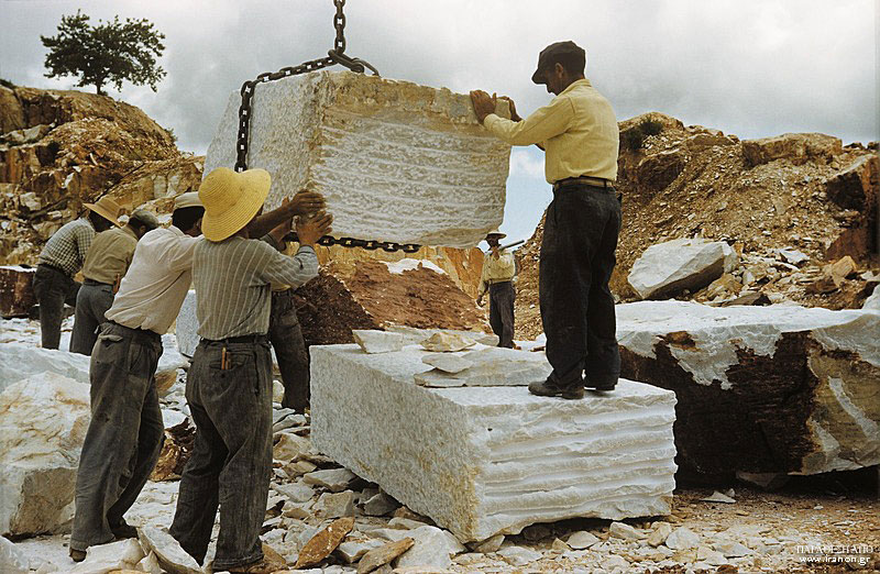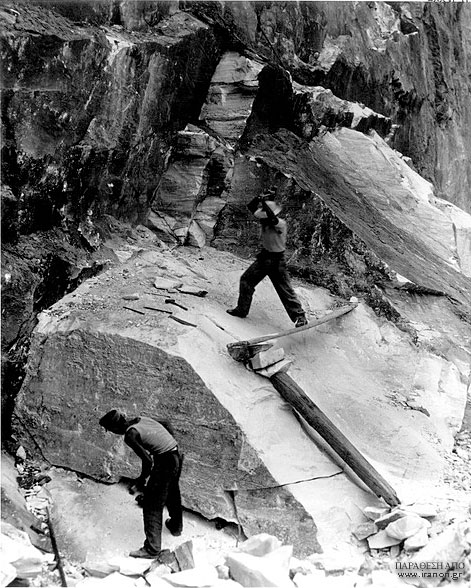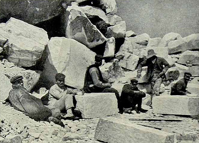 Αριστερά: λατόμοι της Πεντέλης σε φωτογραφία από το, πρώτης έκδοσης 1900, βιβλίο "Peoples of all nations : their life today and the story of their past". Κέντρο και δεξιά: φωτογραφίες από τα λατομεία Διονύσου, τραβηγμένες στις 13/06/1955 και καταχωρημένες στο αρχείο της Αμερικανικής Σχολής Κλασσικών Σπουδών της Αθήνας. |