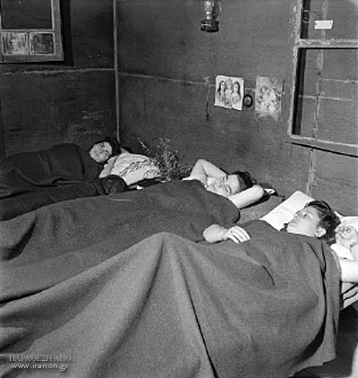 Κοπέλες με φυματίωση σε σανατόριο της Πεντέλης. Φωτογραφία τραβηγμένη περί το 1945 από την Βούλα Θεοχάρη Παπαϊωάννου, καταχωρημένη στο αρχείο του Μουσείου Μπενάκη (http://www.benaki.gr). |